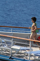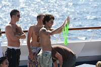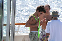 And then it happened. Someone brought up a wad of bright green fabric, which turned out to be a replica of the bathing suit/man thong that Borat wears in the movie. Un-freaking-real. So we're all hooting and hollering and egging him on, and.... he puts on the effing suit. Yes, folks, I witnessed John Mayer in a man thong. It pretty much made my life. He came back upstairs with a wrap around his waist, proceeded to drop the wrap and start posing like he was gonna be on the cover of Sports Illustrated Swimsuits Edition. Then he decided that it would be a sweet idea to take a lap around the deck ... jogging ... in the man thong. Priceless. I'm still laughing about it. No lie.