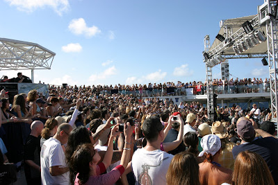 we woke up early the next morning, yet again. this time, though, the lido deck was completely saved and/or filled by 830am by people that had been camped out since 530am. it's possible there were people there earlier, but that was the craziest time i encountered. crazy crazy CRAZY. that's the only word to describe the madhouse. since we actually wanted to enjoy some time outside, we made our way back to siren's pool, where there were plenty of empty lounges at the time. great conversation with friends again, and a good time chillaxin'. at some point in the morning, john went up to the deck that was cordoned off for him. my friend and i were thankfully under his deck, as opposed to the gawking side.
